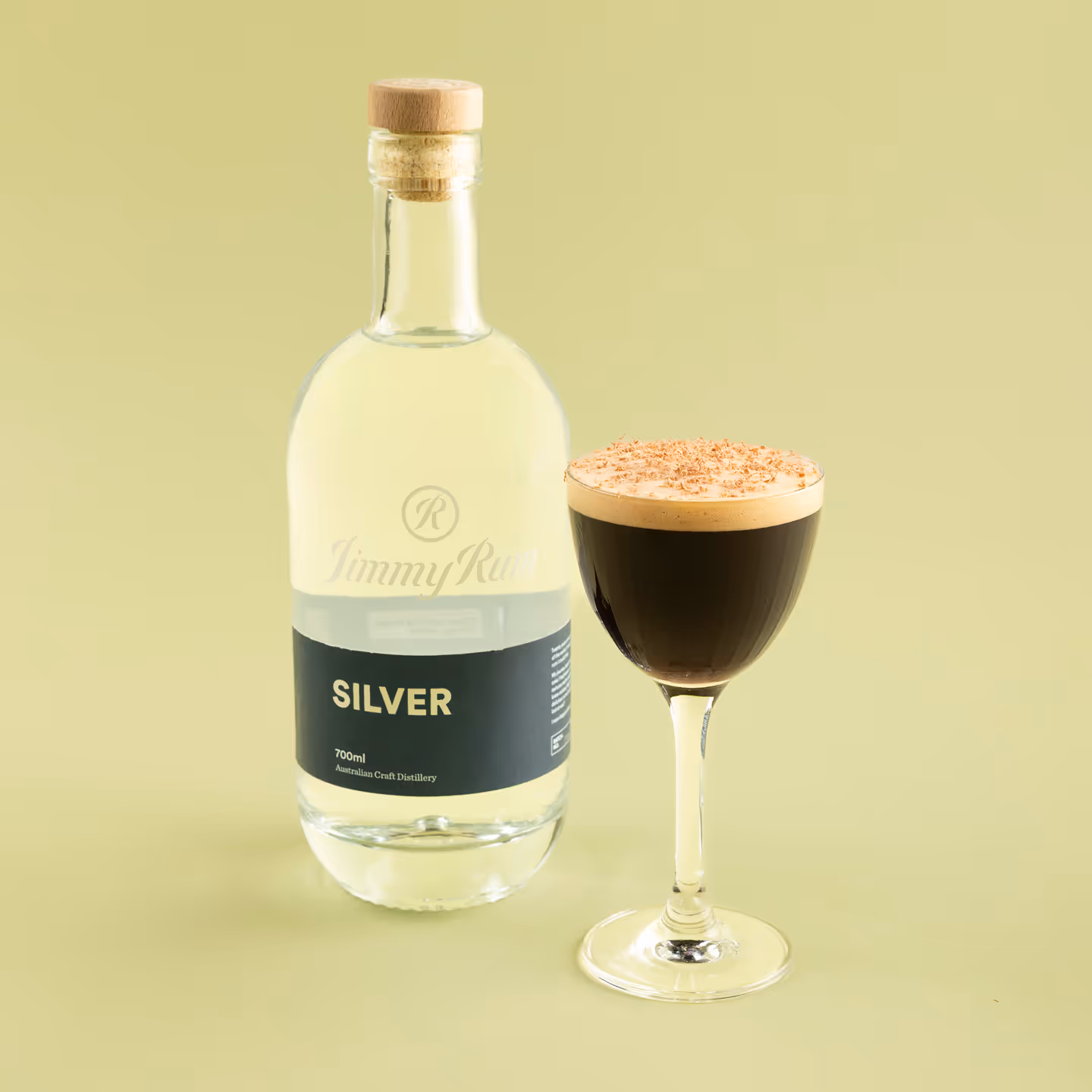 JimmyRum Silver infused with coffee beans, espresso, White Possum Hazelnut, White Possum Dark Cacao, wonderfoam