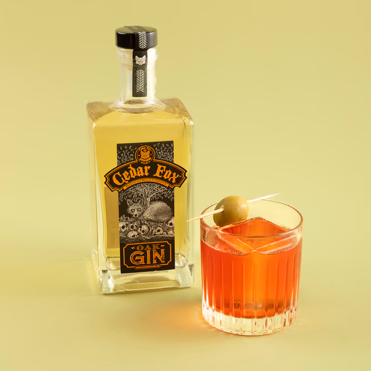 Cedar Fox Oak Gin, Saison house vermouth, Maidenii Roselle Naturi Dirty dry vermouth, olive bitters