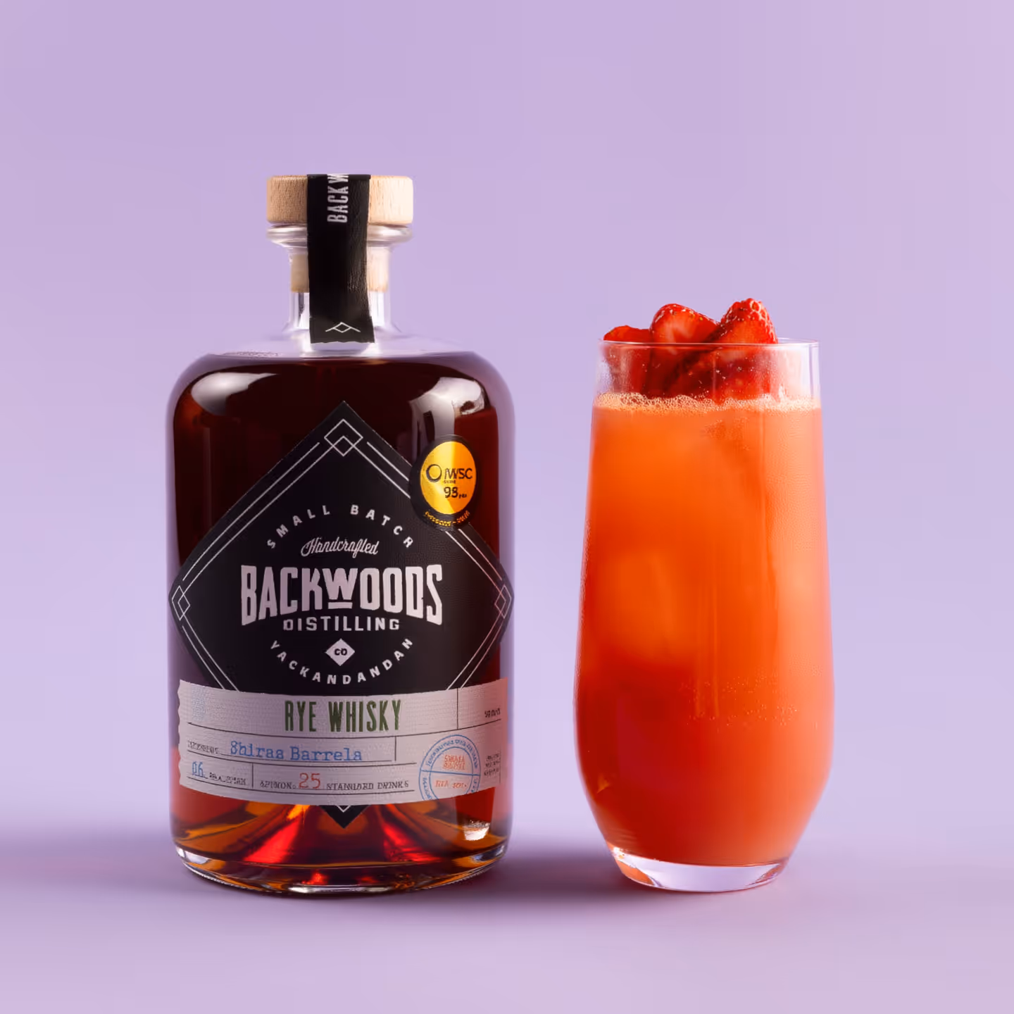 Backwoods Rye Whisky Shiraz Barrels, Brookies Sundrift aperitivo, lemon juice, quandong seed syrup, ginger beer, strawberry